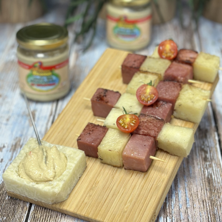 Brochette de jambon de Noël et igname à la sauce des Boucaniers au gingembre